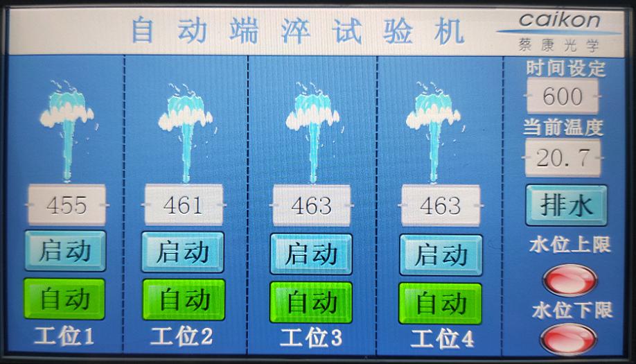 2、所有淬火相關參數都數字化顯示,液晶屏上可顯示啟動模式,溫度監控,水位狀態,自動排水開關狀態,當前溫度,設定溫度,淬火時間,淬火數量計數(其它參數可按要求定制)。